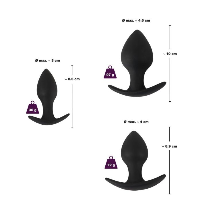 Deze buttplug set van Black Velvets is zeer geschikt om te beginnen met anale seks. De buttplug set bestaat uit 3 verschillende buttplugs, van klein tot groot. Alle plugs zijn gemaakt van zijdezacht en flexibel siliconen. De flexibele vleugels aan de onderzijde voorkomen dat de plugs naar binnen schieten. Let op: gebruik uitsluitend een glijmiddel op waterbasis in combinatie met siliconen toys. Schoonmaken kan eenvoudig met water en een milde zeep of met één van onze speciale toycleaners.
