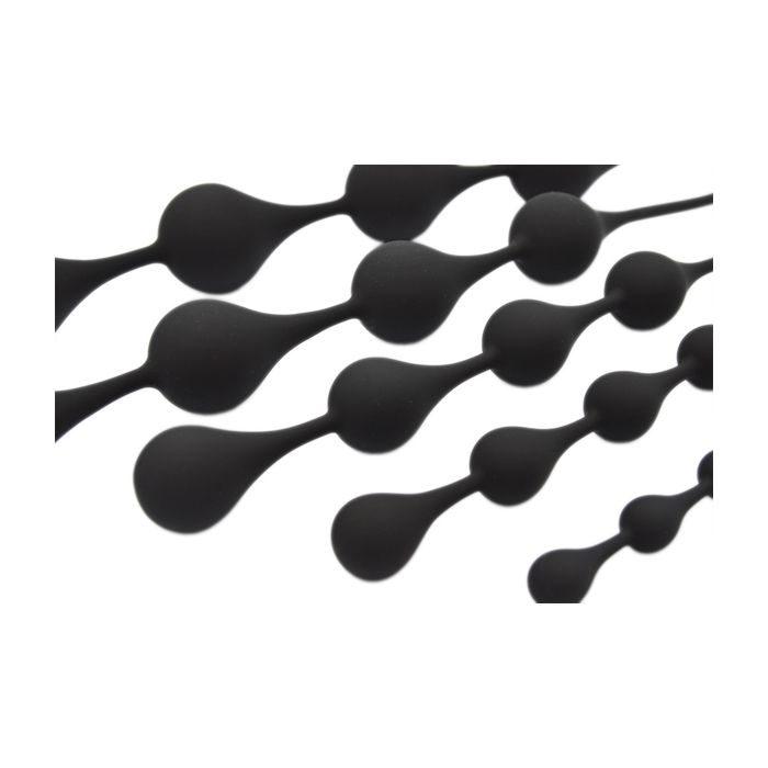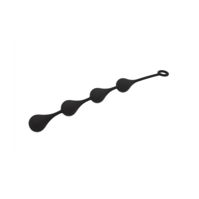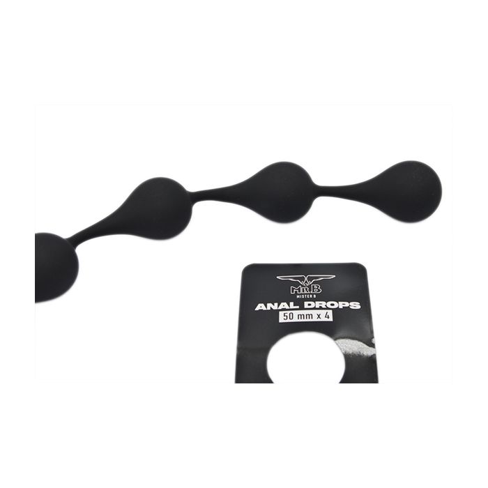 De Anaal druppels Mister B heeft 4 zijdezachte zwarte rubberachtige siliconen druppels die flexibel zijn verbonden met een stevige snoer. De dildo is gemaakt van FDA-goedgekeurde siliconen en door de vingerlus makkelijk te verwijderen. Elke druppeldiameter is 4 cm en de totale druppellengte is 3.4 cm. Maak de dildo na gebruik goed schoon met een toycleaner.