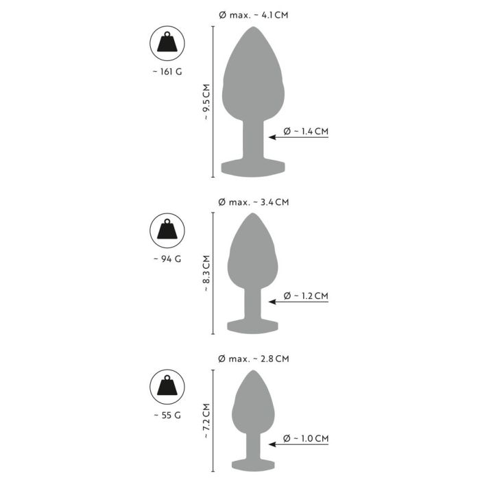 Die einzelnen Plugs sind in verschiedenen Größen erhältlich, um den unterschiedlichen Bedürfnissen und Erfahrungsstufen gerecht zu werden. Der Plug S in klarem Design hat eine Gesamtlänge von 7,2 cm und einen Durchmesser von 0,4 bis 2,8 cm, während der Plug M in Türkis eine Länge von 8,3 cm und einen Durchmesser von 1,2 bis 3,4 cm aufweist. Der größere Plug L in Lila misst 9,5 cm in der Gesamtlänge und hat einen Durchmesser von 1,3 bis 4,1 cm. Mit Gewichten von 55 g, 94 g und 161 g bieten diese Plugs eine Vielzahl von Empfindungen, die sowohl für Anfänger als auch für erfahrene Nutzer geeignet sind. Hergestellt aus hochwertigem Metall und Acryl, garantieren sie nicht nur Langlebigkeit, sondern auch ein sicheres und angenehmes Erlebnis.