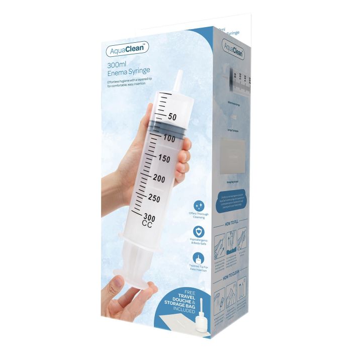 De AquaClean Klysmaspuit van 300 ml is jouw ideale partner voor een moeiteloze en effectieve intieme hygiëne! Met zijn innovatieve taps toelopende ontwerp zorgt deze klysmaspuit voor een eenvoudig en comfortabel inbrengen, zodat je je altijd fris en schoon voelt, waar je ook bent. De royale capaciteit van 300 ml garandeert een grondige reiniging zonder gedoe, perfect voor zowel dagelijks gebruik als speciale gelegenheden. Bovendien wordt de set geleverd met een handige, reisvriendelijke compacte douche en een opbergzak, waardoor je jouw hygiëne altijd en overal kunt prioriteren. Of je nu thuis bent of onderweg, met AquaClean maak je van jouw persoonlijke verzorging een zorgeloze ervaring. Kies voor AquaClean en ervaar het gemak van optimale hygiëne!