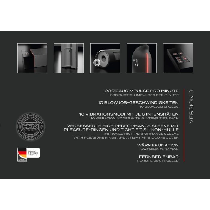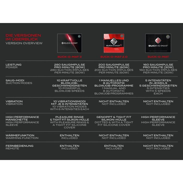 De krachtige motor haalt snelheden tot 280 RPM en wordt gevoed door een betrouwbare AC voedingsadapter voor maximale prestaties. De discrete rode LED-strip pulseert mee met de actie zodat je visueel kunt meegenieten zonder dat het opvalt in de kamer. De Suck-O-Mat 3 wordt standaard geleverd met een L-sleeve maar is ook compatibel met maten M en XL zodat je altijd de perfecte pasvorm kunt kiezen.