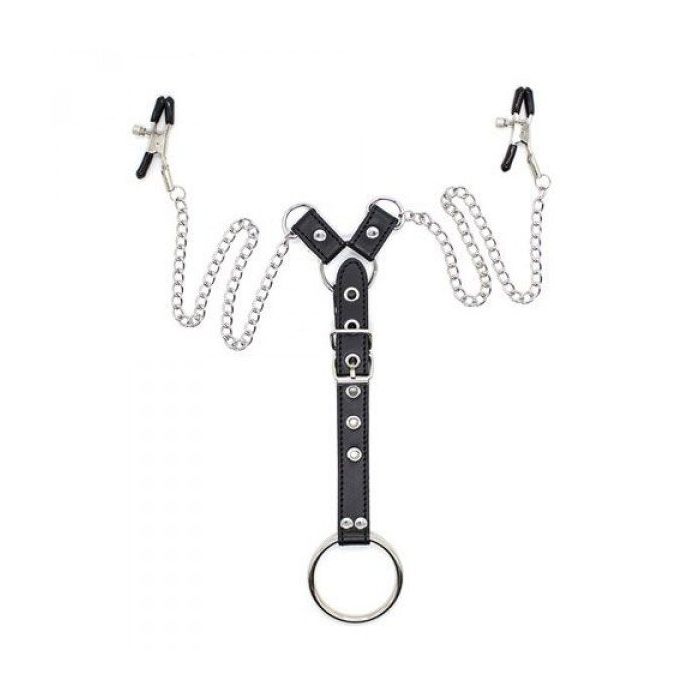 Geniet dubbel zo hard met deze cockring en tepelklemmen in 1! De rvs cockring houdt je penis heerlijk hard, terwijl de tepelklemmen jouw tepels een intense druk geven. De tepelklemmen zijn middels de draaiknopjes in knijpkracht te regelen. De tepelklemmen en cockring zijn met een kunstleren verstelbaar riempje met elkaar verbonden.
