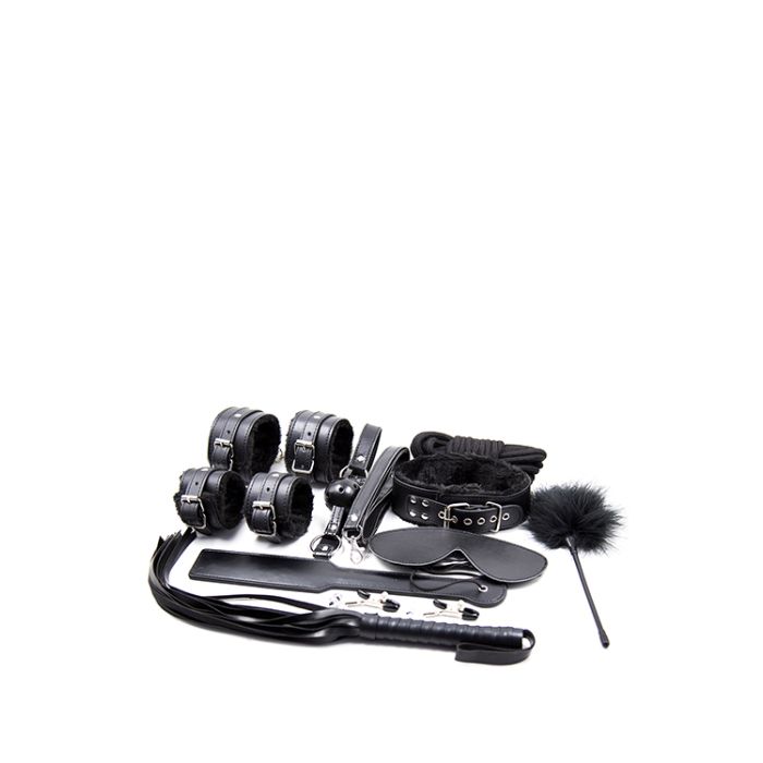 - Inhoud: Ballgag, Enkelboeien, Handboeien, Blinddoek, Flogger, Paddle, Tepelklemmen, Kietelaar, Halsband en Bondage touw
