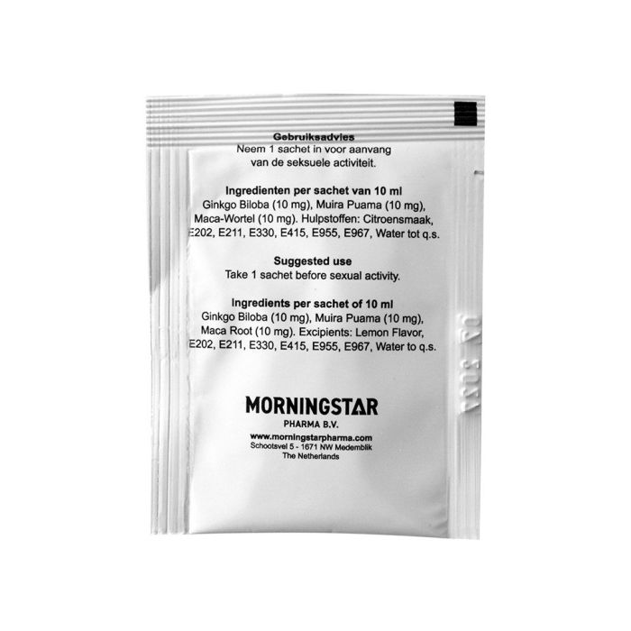 Xylitiol-Poeder (E-967) 1000 mg, Citroensmaak 200 mg, Xanthaangom (E-415) 60 mg, Ginkgo Biloba E.S. R4/1 10 mg, Muira Puama E.S., Verhouding 4/1-PR 2454-ARR 10 mg, Macawortel E.S. 7-9 / 1-ALK FREE-ARR 10 mg,