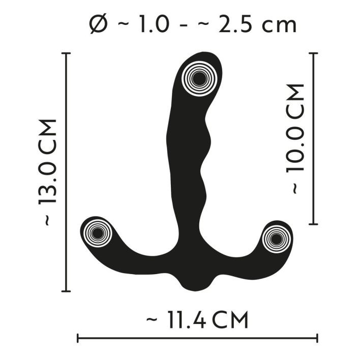 De driedubbel anaal plezier prostaatstimulator van ANOS is anatomisch perfect gevormd en heeft drie armen met elk een krachtige motor die zeven vibratiestanden biedt. De centrale schacht is golvend en heeft een schuine kop die naar boven toe breder wordt, waardoor de P-spot feilloos wordt bereikt. Naast de prostaat en het anale kanaal worden ook de anusring en het perineum gestimuleerd door de vibrerende anaalstopper.