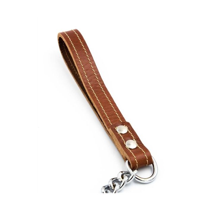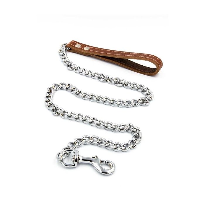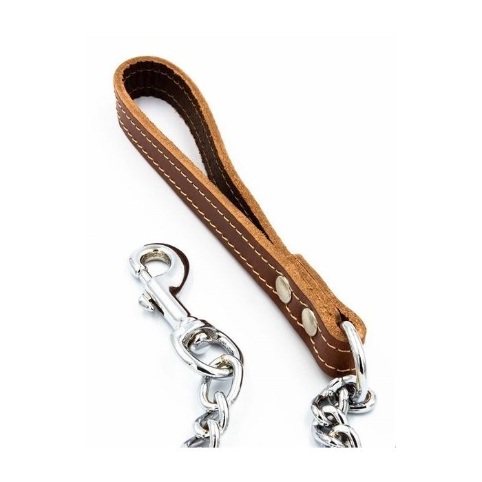 Met deze Hondenriem van Mister B hou jij je ondeugende puppy onder controle. Deze stijlvolle riem heeft een handvat van hoogwaardig bruin tuigleer. De ketting is lekker dik, met een behoorlijke lengte, zodat je je pup een beetje ruimte kunt geven om rond te snuffelen. De ketting heeft een sterke clip aan het uiteinde om aan de halsband of het tuigje van je pup te bevestigen.