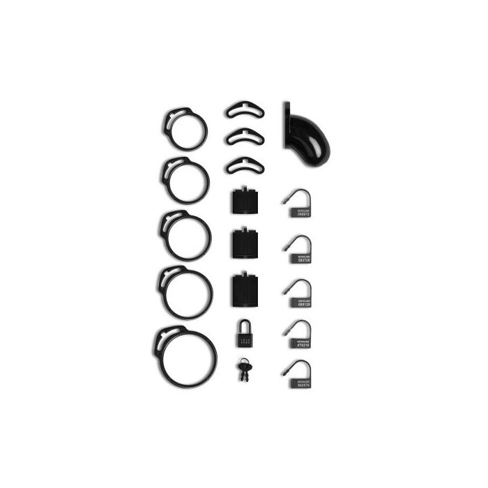 Deze geweldige set wordt geleverd met vijf ringen in verschillende maten (4,5 - 6,5 cm), zodat je altijd de perfecte pasvorm kunt vinden. Daarnaast bevat de set een metalen hangslot met twee sleutels en vijf plastic genummerde hangsloten. De plastic sloten kunnen eenvoudig met een schaar worden verwijderd na gebruik, maar de unieke nummers op elk slot zorgen ervoor dat de drager de chastity cage niet stiekem kan verwijderen en een nieuw slot kan aanbrengen zonder betrapt te worden.
