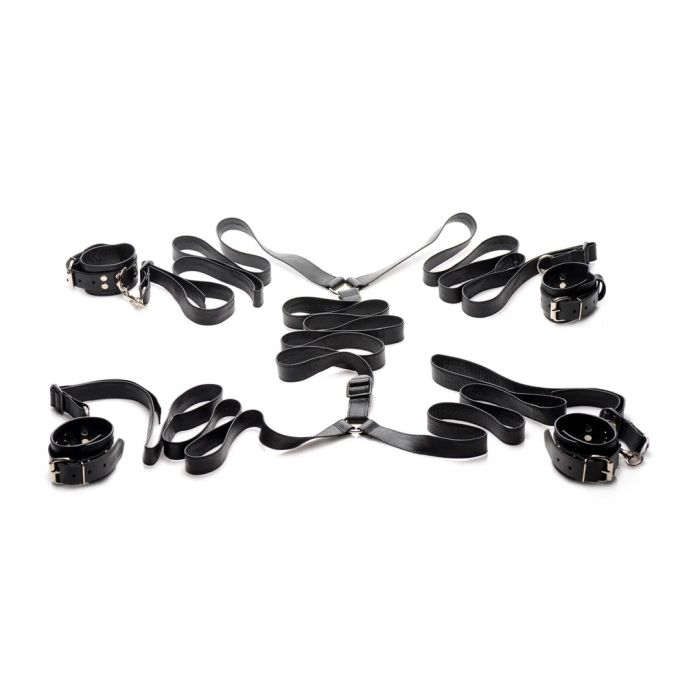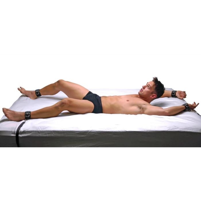 Deze leren bondage set is speciaal ontworpen voor de fijnproever die zijn of haar privé-momenten naar een hoger niveau wil tillen. Deze set overstijgt de standaard bondage kits met zijn heavy-duty hardware en elegante afwerking, waardoor het niet alleen een functioneel, maar ook een stijlvol accessoire is voor jouw slaapkamer. Het innovatieve verstelbare systeem past moeiteloos onder elk matras, wat zorgt voor een discreet en gebruiksvriendelijk ontwerp. De strategisch geplaatste verstelbare riemen aan de zijkanten of aan het hoofd en de voet van jouw bed bieden je de vrijheid om te experimenteren met verschillende posities en scenario's, waardoor elke ervaring uniek en spannend is. De stevige draaiklippen sluiten veilig aan op de D-ringen van de luxe leren pols- en enkelboeien, zodat je jouw partner op een speelse manier kunt beperken en de spanning kunt opbouwen. Laat jouw fantasieën werkelijkheid worden en geniet van een onvergetelijke ervaring met deze hoogwaardige bondage gear, die niet alleen de zintuigen prikkelt, maar ook de band tussen jou en je partner versterkt.