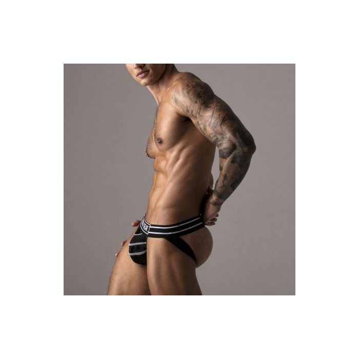 De kunstleren details en contrasterende stiksels geven deze jockstrap een stoere, edgy uitstraling die perfect is voor zowel sportieve als casual gelegenheden. De brede banden onder de billen accentueren je rondingen op een flatterende manier, waardoor je er niet alleen goed uitziet, maar je ook zelfverzekerd voelt.