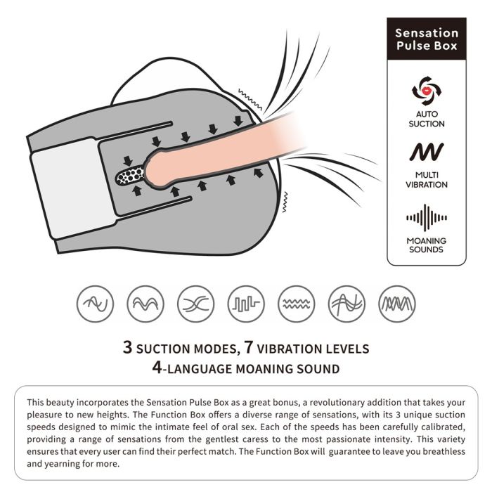 Maak kennis met de Streetgirl's Masturbator, een meesterwerk dat je intieme ervaringen naar ongekende hoogten tilt. Dit prachtig ontworpen genotsapparaat heeft een realistische, gespreide vagina die je zintuigen prikkelt vanaf het eerste moment. Met afmetingen van 20,4 x 24 x 14,5 cm en een gewicht van 2,67 kg is deze elegante beauty gebouwd om jarenlang intens genot te bieden. De Sensation Pulse Box, een revolutionaire toevoeging, biedt een scala aan sensaties met drie unieke zuigsnelheden die de intieme ervaring van orale seks perfect nabootsen. Of je nu op zoek bent naar een zachte streling of een passionele climax, deze functie garandeert dat je elke keer weer buiten adem raakt en verlangt naar meer. Met realistische kreungeluiden en zeven vibratiestanden zorgt de Sensation Pulse Box voor een werkelijk verbluffende ervaring. En het schoonmaken? Een fluitje van een cent! Verwijder eenvoudig de Sensation Box, spoel het kanaal af met stromend water en je bent klaar voor het volgende avontuur. Vergeet niet om voldoende glijmiddel te gebruiken voor een moeiteloze ervaring. Dit is de ultieme manier om jezelf te verwennen!