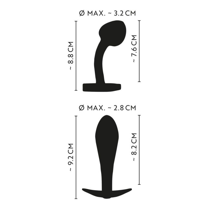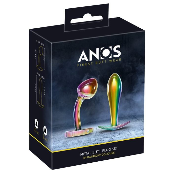 De Metalen Buttplug Set van Anos heeft 2 metalen anaalpluggen in glinsterende regenboog kleuren. De ene heeft een klassieke conische vorm, de andere is licht gebogen met een gevormde prostaat punt. Beide plugs hebben een brede onderkant voor veilig en comfortabel inbrengen. De metalen pluggen zijn ook geweldig voor temperatuurspel. Zet ze gewoon in de koelkast om af te koelen of in een waterbad om op te warmen.