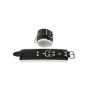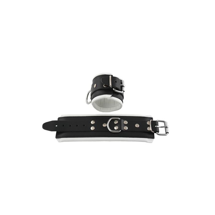 De polsboeien zijn verstelbaar dankzij de gesp en riem, waardoor ze geschikt zijn voor verschillende polsmaten. De zwarte buitenkant geeft een stoere uitstraling, terwijl de witte binnenkant zorgt voor een opvallend contrast.