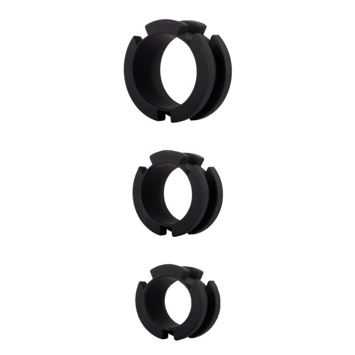 Deze set bestaat uit drie ringen in verschillende maten (25 - 30 - 40 mm), die ontworpen zijn om eenvoudig aan de peniskoker bevestigd te worden met behulp van de bijgeleverde riempjes. De sleeve van de kooi heeft drie spijlen en elke ring heeft drie inkepingen, waardoor een naadloze aansluiting ontstaat tussen de ringen en de spijlen van de penissleeve.
