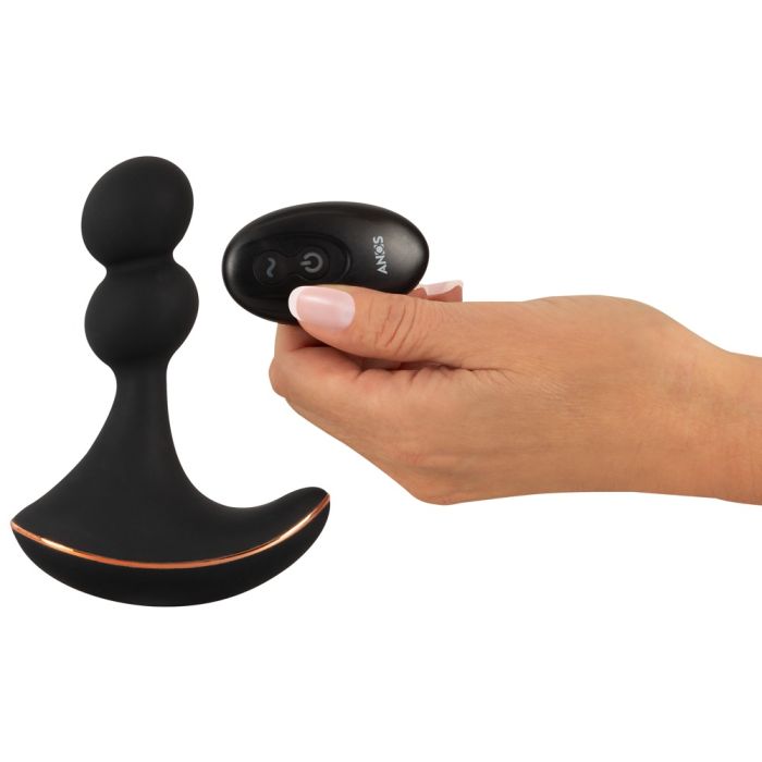 De Prostaat Vibrator RC Rotating van Anos heeft roterende dubbele balvormige top die specifiek de prostaat verwent tijdens anale massage. Twee krachtige motoren zorgen voor de intense rotatie en de diepe trillingen, die ook sterk voelbaar zijn in de verbrede gebogen basis om de anus en het perineum te stimuleren. Je kunt 5 rotatiesnelheden en 7 vibratiestanden gemakkelijk bedienen met de bijgeleverde afstandsbediening tot een bereik van 10 meter.