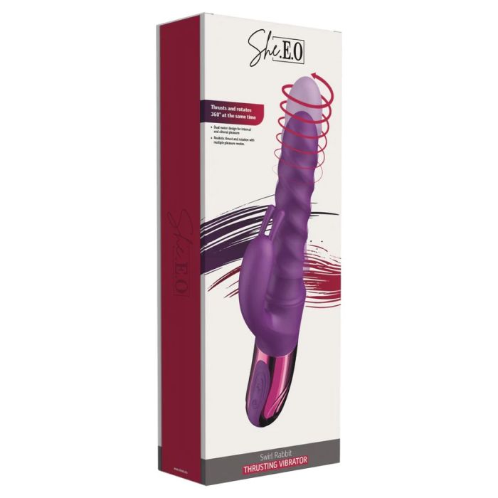 De Swirl Rabbit Thrusting Vibrator van She.EO is een revolutionair genotsspeeltje dat speciaal is ontworpen voor vrouwen die verlangen naar een diepere, ritmische stimulatie. Met zijn unieke inbrengbare schacht biedt deze vibrator een ongeëvenaarde sensatie door op en neer te stoten en tegelijkertijd 360° rond zijn as te draaien. Kies uit maar liefst 5 verschillende rotatiestanden – twee die naar links draaien, twee naar rechts en één die moeiteloos tussen beide richtingen wisselt. Combineer dit met 5 krachtige stootintensiteiten en je ervaart levensechte bewegingen die je genot naar ongekende hoogtes tillen.
