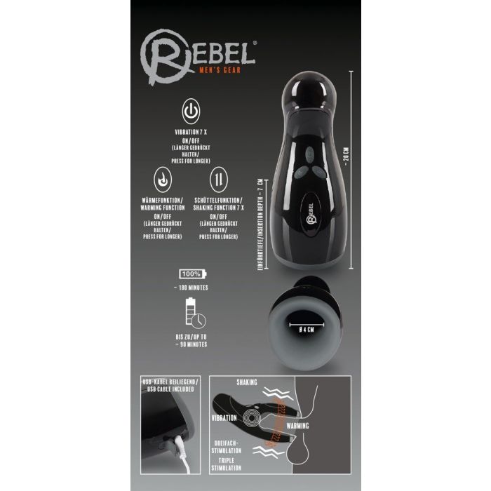 Geniet van explosieve hoogtepunten met deze 3-in-1 masturbator van Rebel. De masturbator beschikt over vibraties, verwarmingsfunctie en op- en neergaande bewegingen. Het apparaat beschikt over een handzaam design en is oplaadbaar via de meegeleverde usb-kabel. Bediening gaat eenvoudig via 3 knoppen voor aparte bediening van de functies. Vibraties in 7 standen, op- en neergaande beweging in 7 snelheden en verwarmingsfunctie tot 40 °C. De buitenkant is gemaakt van stevig ABS en de binnensleeve van zijdezacht siliconen. Totale lengte 20 cm, invoerdiepte 7 cm, Ø 4 cm.