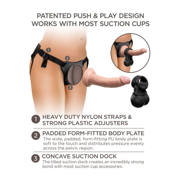 De Strap-on Vibrator Body Dock Kit van King Cock is een complete set voor strap-on plezier. De meegeleverde vibrator is gemaakt van hoogwaardig dual density siliconen en biedt 7 vibratiestanden en 3 snelheden, eenvoudig te bedienen met de afstandsbediening. De bijpassende cockring heeft realistische ballen die ook kunnen trillen voor extra stimulatie. Dankzij de verstelbare bandjes past de strap-on perfect op jouw lichaam. Beide onderdelen zijn volledig oplaadbaar via de meegeleverde USB-kabel en waterdicht. Na gebruik maak je de vibrator en cockring eenvoudig schoon met een toycleaner voor hygiënisch plezier.