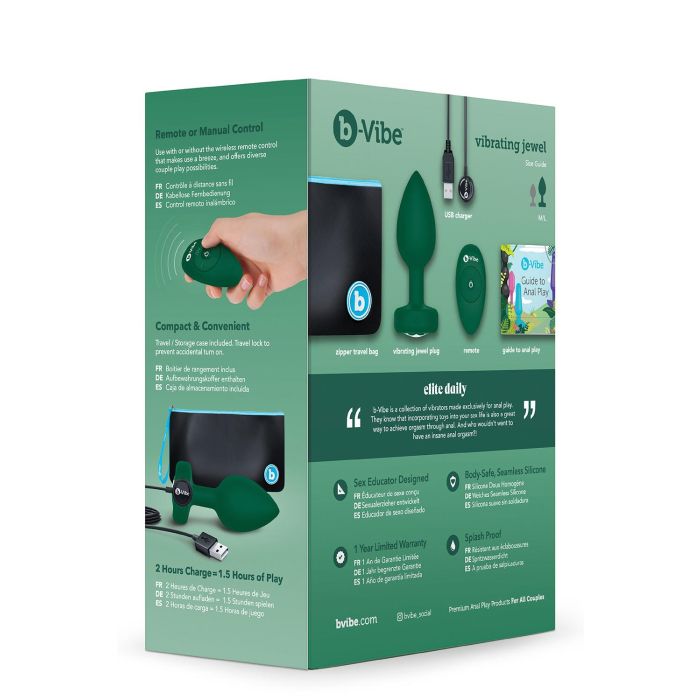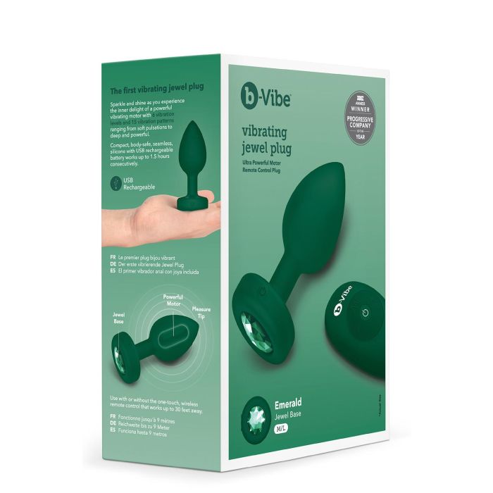 De handgreep van de buttplug is glad en comfortabel, en heeft een prachtige juwelenbasis die een vleugje glamour toevoegt aan je speeltjescollectie. Kortom, de Vibrerende Buttplug B-Vibe M/L - Groen is een hoogwaardig en veelzijdig speeltje dat je plezier en genot zal bezorgen.