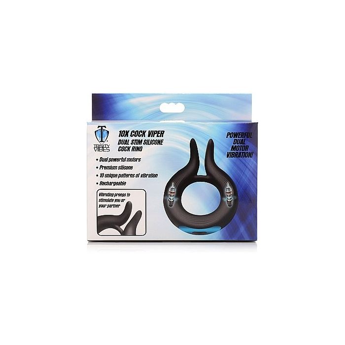 De Vibrerende Cockring TM 10X Cock Viper van Trinity Vibes combineert comfort met krachtige sensaties. Het rekbare siliconenmateriaal zorgt voor een strakke, comfortabele pasvorm onder de ballen, terwijl de addertanden in lijn staan met de clitoris van je partner voor maximale stimulatie. Met 10 verschillende vibratiestanden kun je zelf kiezen hoe intensief de ervaring wordt. Gebruik een glijmiddel op waterbasis voor een soepele plaatsing. Wanneer de batterijen leeg zijn, laad je de cockring eenvoudig op met de meegeleverde USB-kabel. Bodysafe en makkelijk schoon te maken, deze cockring biedt langdurig plezier voor jullie beiden.