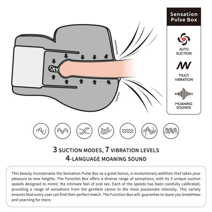 Maak kennis met de Streetgirl's Masturbator, een meesterwerk dat je intieme ervaringen naar ongekende hoogten tilt. Dit genotsapparaat is niet alleen prachtig vormgegeven met een realistische, gespreide vagina, maar het wordt ook geleverd met de verleidelijke Boudoir string die je zintuigen prikkelt vanaf het moment dat je het in gebruik neemt. Met afmetingen van 19,7 x 20 x 14 cm en een gewicht van 2,52 kg, is deze elegante body ontworpen om jarenlang intens genot te bieden. De Sensation Pulse Box, een revolutionaire toevoeging, biedt een scala aan sensaties met drie unieke zuigsnelheden die de ervaring van orale seks perfect nabootsen. Of je nu op zoek bent naar een zachte streling of een passionele intensiteit, deze functie zorgt ervoor dat je altijd de juiste match vindt. Met realistische kreungeluiden en zeven vibratiestanden, garandeert de Sensation Pulse Box een werkelijk verbluffende ervaring die je keer op keer in vervoering zal brengen. Het onderhoud van dit luxe apparaat is eenvoudig; verwijder de Sensation Box en spoel het kanaal af met stromend water. Voor een optimale ervaring raden we aan om voldoende glijmiddel te gebruiken, zodat je moeiteloos kunt genieten van elk gebruik. Druk herhaaldelijk om te schakelen tussen verschillende talen en laat je meevoeren in een wereld van genot!