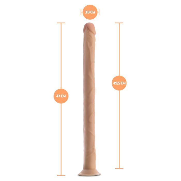 Deze XXL dildo is perfect voor degenen die op zoek zijn naar diepe anale penetratie. Het extra lange model is gemaakt van buigzaam PVC en kan gemakkelijk worden ingebracht met behulp van voldoende glijmiddel. De dildo is prachtig gedetailleerd en heeft alle kenmerken van een echte penis, waardoor je een realistische ervaring krijgt. Met zijn sterke zuignap kan de dildo eenvoudig op een vlakke ondergrond worden bevestigd, zodat je handsfree kunt genieten van je nieuwe aanwinst. Om optimaal te genieten en hygiëne te waarborgen, raden wij aan om een flesje glijmiddel en toycleaner bij te bestellen. Deze XXL dildo is een geweldige toevoeging aan je collectie en zal zeker voor veel plezier zorgen.