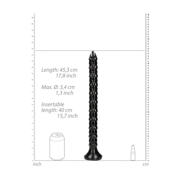 Geniet van een extreem diepe penetratie met de XXL Dildo Scaled Anal Snake van het merk Ouch! De dildo is gemaakt van heerlijk buigzaam PVC en heeft een invoerdiepte van maar liefst 40 cm. Dankzij de geribbelde schacht kan je genieten van een extra stimulatie. Gebruik je favoriete glijmiddel om de dildo moeiteloos in te brengen. Na gebruik is deze extra lange anaal dildo gemakkelijk schoon te maken met water en een milde zeep of met één van onze speciale toycleaners.
