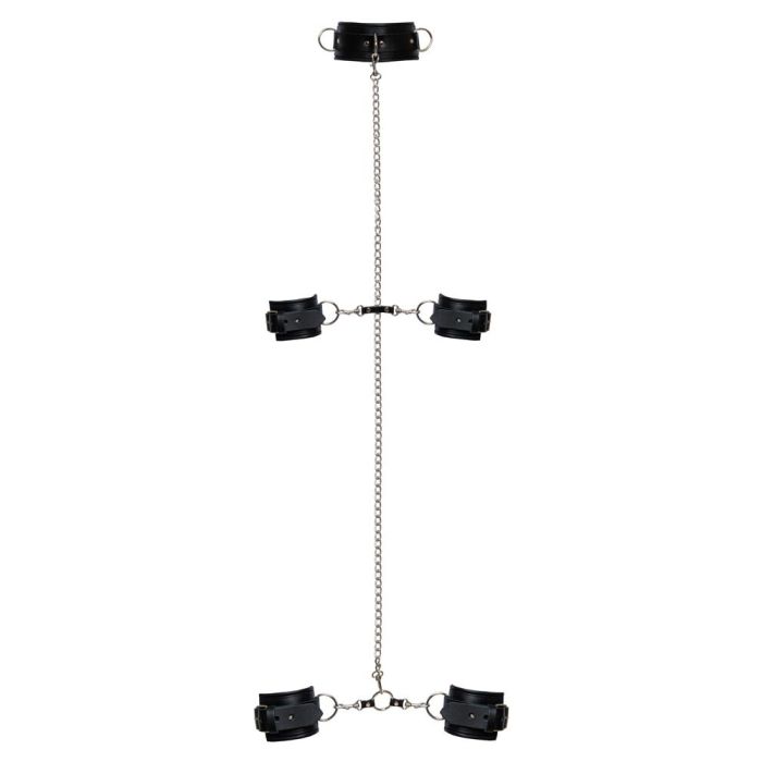 De Zado Professionele Complete Bondage Bevestigingsset is de ultieme keuze voor liefhebbers van professionele bondagespellen! Deze hoogwaardige set is vervaardigd uit luxe zwart leer en is voorzien van stijlvolle zilverkleurige accessoires. De set omvat een nekboei met riem, handboeien, enkelboeien, een hogtie en een lange karabijnketting, zodat je eindeloos kunt experimenteren met verschillende bondageposities. Met vier goudkleurige sloten en sleutels voor extra veiligheid, ben je verzekerd van een spannende en veilige ervaring.